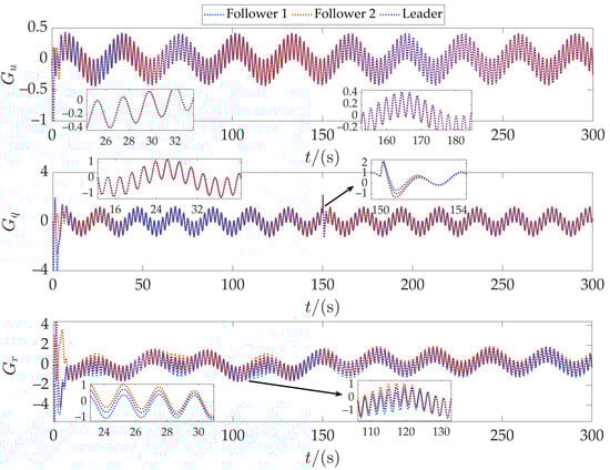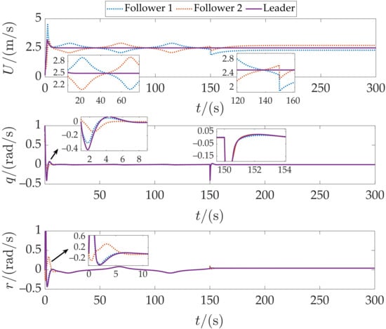Figure 11 compares the speeds of the followers and the leader. Due to the different generalized positions of each AUV, their longitudinal speeds vary. During Phase 1 (S-shaped curve, 0–150 s), the speeds of the two followers exhibit symmetrical fluctuations. This is because, at the curve bends, their angular velocities are consistent, but their curvature radii differ, resulting in differences in longitudinal speed (which must be lower or higher than the leader’s speed). In Phase 2 (circular path, after 150 s), all AUVs have the same angular velocity, and their longitudinal velocities are distributed in parallel according to their respective motion radii. The AUVs can maintain the desired formation, demonstrating that the formation coordination controller can effectively form and maintain a formation with multiple AUVs. Figure 12 shows the disturbance estimation performance of the three AUVs, indicating that the overall disturbance estimation performance is good. However, brief instability occurs at the instant when the path and formation are switched simultaneously at 150 s.