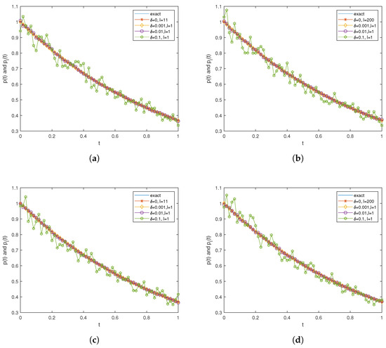 Results of Example 1 corresponding to different noise levels: (a) , (b) , (c) , . (d) , .