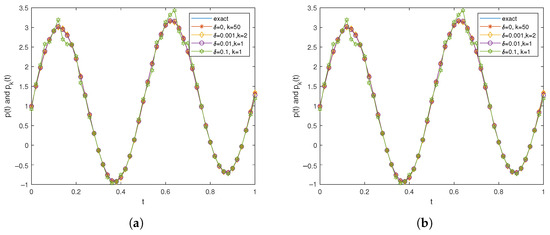 Figure 4 presents the inversion results of a piecewise function. Analysis reveals that the numerical solutions exhibit good agreement with the exact solutions when . However, under a higher noise level (), a clear instability in the numerical solutions becomes evident. This instability is primarily attributed to the discontinuities inherent in the piecewise function, which propagate uncertainties in the numerical computations. These observations underscore the challenges in maintaining numerical stability for functions with discontinuities during the inversion process.