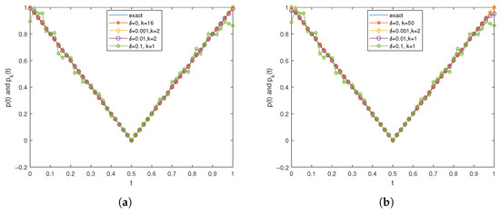 According to Figure 1, there is no significant difference between the computational results for and . Specifically, regardless of which value of is chosen, the obtained numerical solutions show very similar performance in terms of both accuracy and convergence. This indicates that, in the context of this problem, the choice of the parameter has little impact on the final results. Therefore, in the subsequent examples and numerical experiments, we will focus on analyzing the case of in order to simplify the analysis and reduce the computational effort. This approach not only helps to highlight the main features of the method but also makes the results more representative and comparable.
