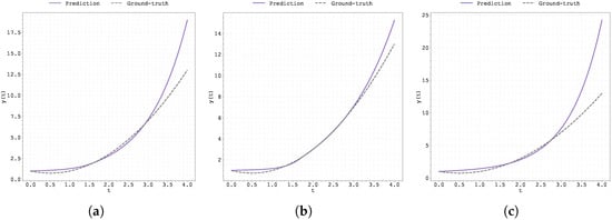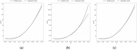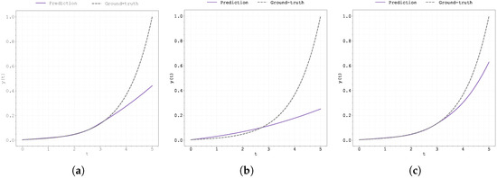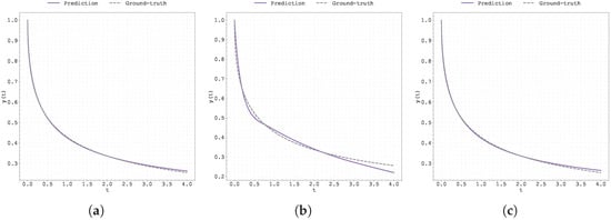 Plot of the predicted and ground-truth curves from the best run in Case Study 1 with initialised at : (a) the original, (b) clipped, and (c) pre-trained Neural FDE models.