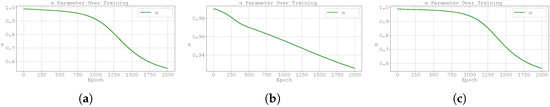 This particular example is noteworthy because the analytical solution does not depend on the value of , allowing the model to converge to an arbitrary fractional order. However, it is important to note that the neural network is trained to approximate the fractional derivative itself, not the solution . As such, its output inherently depends on the order . Although it is not possible to directly compute the error between the predicted and the true value of in this case, the model’s behaviour during the search for the optimal solution provides insight into how it adapts to the problem structure.