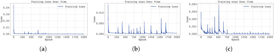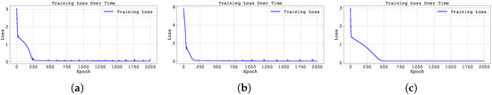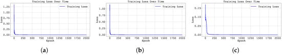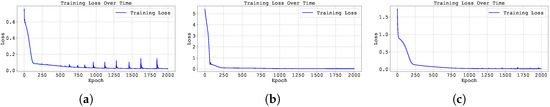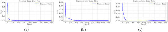 Training loss across epochs for the best run in Case Study 2 with : (a) the original, (b) clipped, and (c) pre-trained Neural FDE models.