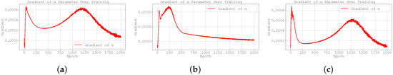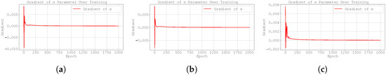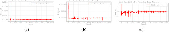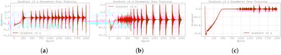 Figure 4 shows that the gradients of the loss function with respect to are very small in this case study. This may explain why the gradient clipping technique does not yield improved results. The Adam optimiser combines momentum and adaptive learning rates by computing exponential moving averages of both the gradients and their squared values. As a result, it adjusts the step size dynamically based on the history of gradients. However, when the gradients are consistently small, the adaptive nature of Adam may result in updates that are too conservative, thereby limiting the optimiser’s ability to escape flat regions of the loss landscape or to sufficiently update . The effectiveness of the gradient clipping methodology will be better assessed in the following case studies, where larger gradients are expected to arise.