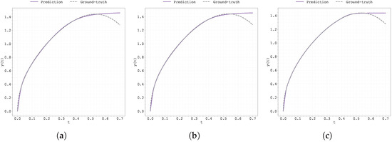 Plot of the predicted and ground-truth curves from the best run in Case Study 4 with initialised at : (a) the original, (b) clipped, and (c) pre-trained Neural FDE models.