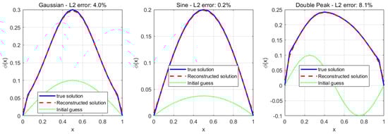 Figure 1 illustrates that optimal solutions are successfully found for three different initial conditions (Gaussian, sine, and double peak). The optimization algorithm converges in all cases. The reconstructed solutions are in high agreement with the true solutions.