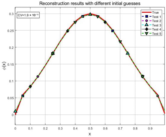 The parameters in Figure 2 are the same as those in Figure 1, with the target Gaussian initial condition given by . There are five significantly different initial guesses, and the five reconstructed solutions (displayed in different colors) converge to nearly identical curves, which are visually indistinguishable from the true solution (black dashed line). The coefficient of variation (CV) is , which is close to machine precision, while the maximum inter-solution distance is only .