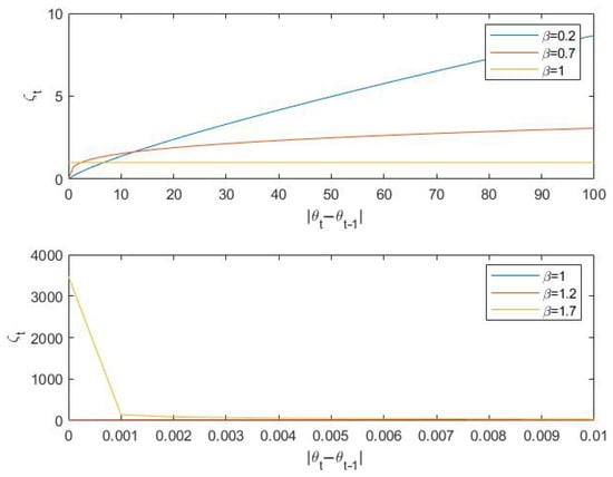 the behavior of depends on values (see Figure 2). For , if , then is upper-bounded and remains finite. Conversely, if , simulations indicate that this does not improve the convergence speed of the algorithm, and, therefore, this range of values is not recommended for FOEM2-FG.