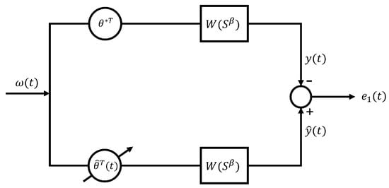denotes the output error, and represents the fractional update law. The signal corresponds to the input or information vector (also referred to as the auxiliary signal). The term captures the parameter error, while is a constant adaptive gain, although it could be generalized to a time-varying gain with its own adaptation law. When , Equation (6) simplifies to fractional-order error model 1 (FOEM1), and when , it transforms into the standard error model 1 (EM1) [].