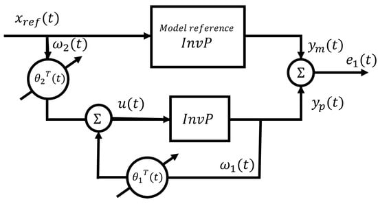 with the error model and adaptation law defined in Equations (7) and (62), respectively, and the information vector equal to . When and , the formulation corresponds to the standard MRAC. In contrast, when and differ from 1, the method corresponds to the fractional-order variant, FOMRAC.
