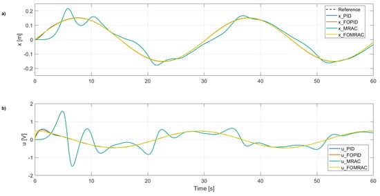 Figure 7b presents the control signal in volts. The MRAC controller generates the most aggressive control action, characterized by high peaks and rapid variations, which may lead to increased energy consumption and actuator wear. The FOPID controller provides a moderately smoother control effort, but exhibits noticeable transients. In contrast, the FOMRAC controller produces the softest and most efficient control signal among all methods, with minimal amplitude and variation, corresponding to the best ISI score (Table 3). This suggests a more energy-efficient use of control effort while maintaining high trajectory-tracking performance. Overall, the FOMRAC strategy outperforms the others in both reference tracking and control efficiency. Although the FOPID controller exhibits the best Quadratic Tracking Variation (QTV), the FOMRAC’s performance remains comparable and well-balanced across all indices.