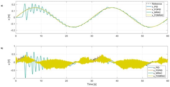 Simulation of control over the movement of the pendulum carriage on the rail. (a) Position x. (b) Control signal in volts v. PID (blue), FOPID (orange), MRAC (green), FOMRAC (yellow).