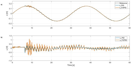 Experimental simulation of control over the movement of the pendulum carriage on the rail with disturbances. (a) Position x. (b) Control signal in volts v. PID (blue), FOPID (orange).