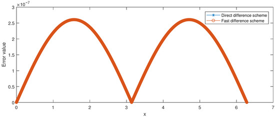 To enhance readability, we also provide the error curve of the direct differential scheme (17)–(19) and fast difference scheme (29)–(33) for and see Figure 1. This also verifies the validity of the two difference schemes.