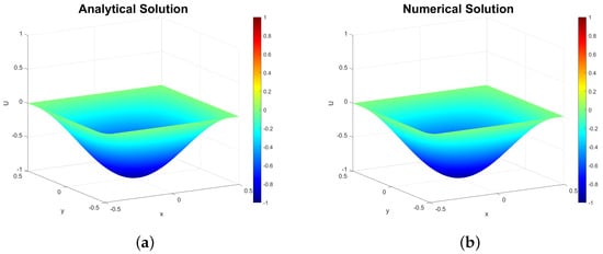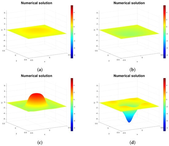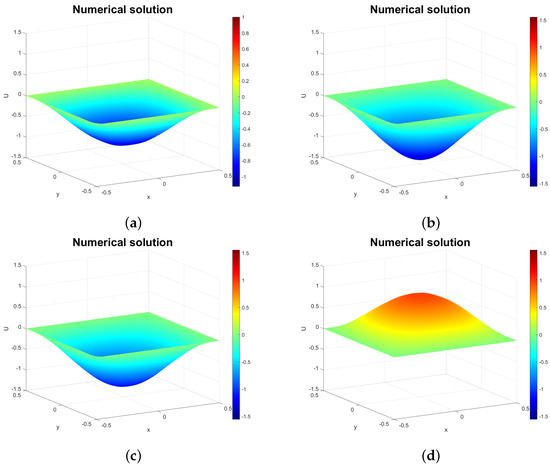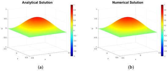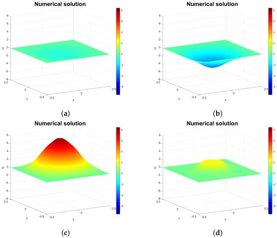 In the present section, we propose the finite-difference discretization of the mathematical model (16). To that end, we will consider regular partitions of the interval in both the x- and y-directions, as well as a regular partition of . Spatially, we will fix partition norms and in the x and y directions, respectively, which satisfy . Moreover, we will temporally fix a partition norm . We define and as positive integers. The spatial and temporal domains are divided into uniform partitions: , , and , where and . For clarity, we define as the exact solution at grid point , while will represent its numerical approximation at the same point.