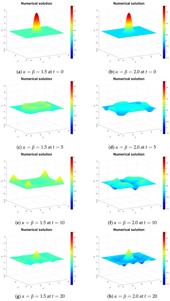 In the first two experiments, we compare solutions with fractional orders against the integer case , while the third experiment examines both fractional orders (1.1, 1.4, and 1.7) and the integer order 2. Figure 7 shows that at , the ring soliton shrinks similarly for both fractional and integer solutions. However, different derivative orders produce distinct oscillation patterns by and (panels c–f). These differences diminish by , where both solutions develop nearly identical structures (panels g–h). Despite variations in oscillation formation and radiation patterns, the overall evolution aligns with observations in [56,57].