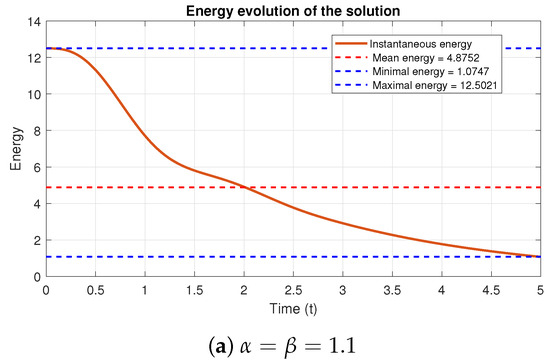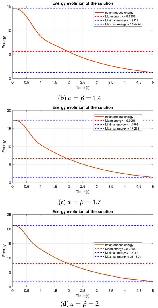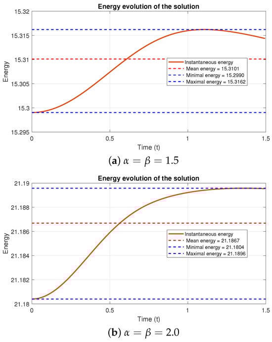 Figure 8 confirms energy conservation in both cases. For (panel a), the maximum deviation is approximately , while for (panel b), it reaches . Figure 9 shows the dissipative case with . Together, Figure 8 and Figure 9 demonstrate that and do not affect energy behavior, they only control energy conservation/dissipation, confirming Theorem 2.