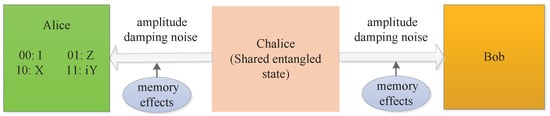 Quantum dense coding is a quantum communication protocol that leverages the properties of quantum entanglement to achieve efficient encoding of information in bit transmission. It allows the sender to transmit two bits of classical information by sending just one quantum bit when they share entangled quantum bits. During the preparation phase, the sender (Alice) and the receiver (Bob) share a pair of entangled quantum bits. In the encoding phase, Alice performs operations on her quantum bit based on the two classical bits she wants to send. For example, if she wants to send “00,” she performs no operation; if she wants to send “01,” she applies an X gate to her quantum bit. In the transmission phase, Alice sends her quantum bit to Bob. During the decoding phase, Bob measures the received quantum bit and decodes the two classical bits of information sent by Alice based on the measurement results. Compared to traditional communication methods, quantum dense coding enhances communication efficiency by allowing the transmission of two classical bits with the sending of just one quantum bit. In this work, as illustrated in Figure 1, the entangled quantum state is initially prepared by a third party (Charlie), and then transmitted to the sender (Alice) and the receiver (Bob) via quantum channels. During this transmission process, the entangled state is affected by amplitude damping noise with memory effects and identical noise strength. In this scenario, we describe the evolution using the time-fractional Schrödinger equation with Caputo fractional derivative, which is known to effectively model such non-Markovian behavior. Considering that environmental interference can lead to the decoherence of quantum entanglement, we need to optimize the channel to suppress noise. By utilizing mutually orthogonal unitary encoding operations, we can mitigate the impact of noise on the system, thereby achieving optimal dense coding capacity. Ultimately, the unitary encoding capacity over a quantum noisy channel can be expressed as follows