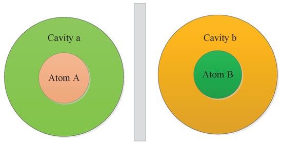In order to simulate the dynamical evolution of a shared entangled state in an amplitude damping noise environment, we use the double Jaynes–Cummings model. As shown in Figure 2, this model consists of two two-level atoms. Each atom is situated in a perfect single-mode nearly resonant cavity and interacts with its initially unexcited cavity mode, while each atom is completely isolated from the other atom and the cavity. The Hamiltonian of the double Jaynes–Cummings model can be expressed as