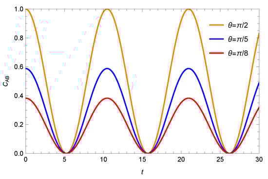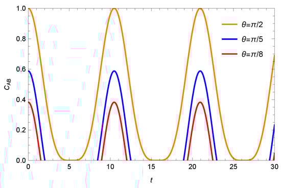 where is the joint density matrix of the A and B quantum systems. is the eigenvalue of density matrix and is the complex conjugate of . Therefore, the concurrence can be obtained by substituting Equation (22) into Equation (24), which is expressed by