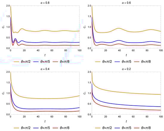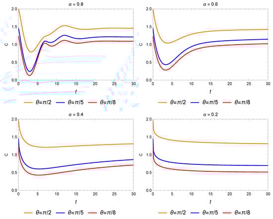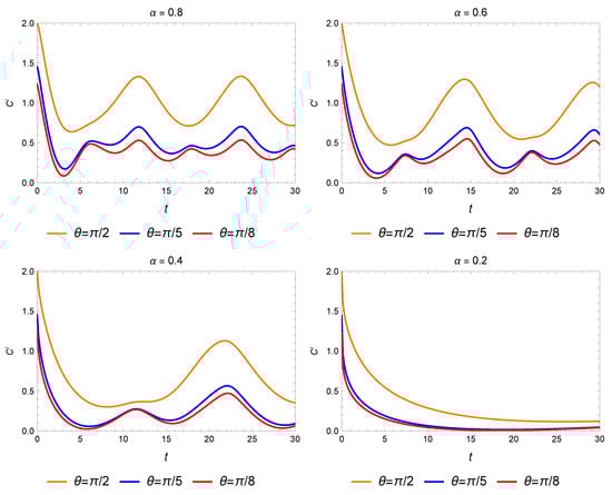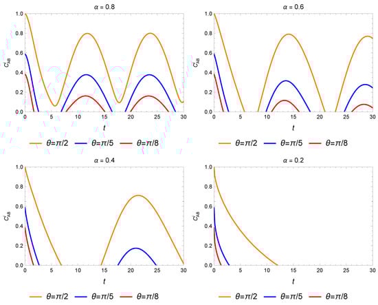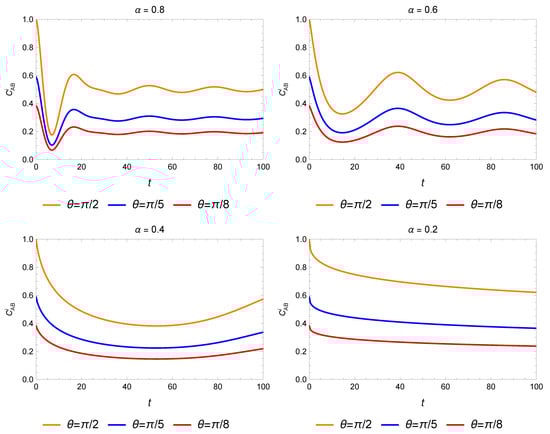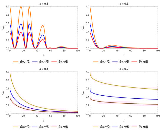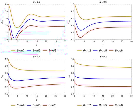 The behaviors of as a function of the parameter t for different parameters with are shown in Figure 3. It is intuitively observed that when the entangled state is not at maximum entanglement, entanglement sudden death can occur as the state evolves over time. Moreover, the time required for entanglement recovery is related to the initial degree of entanglement: the greater the initial entanglement, the shorter the recovery time. Furthermore, by comparing with Figure 3, we find the presence of memory effects () alleviates or even eliminates the occurrence of ESD. As shown in Figure 4, the rate of concurrence decay slows down, and the minimum concurrence value increases with the decrease in the fractional order . This suggests that stronger memory effects play a protective role against entanglement decoherence.