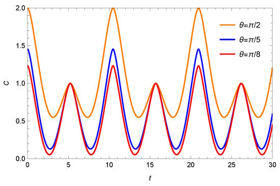 Equation (1) is equivalent to Equation (2) when , and we directly study the influence of memory on entanglement. Figure 11 shows the result of the concurrence as a function of t with for different . Compared with Figure 3, it is clearly evident that the larger the memory effect, the larger the region where entanglement suddenly disappears. In other words, memory promotes the decoherence of entangled states. This result is completely opposite to the one shown in Figure 4. Furthermore, Figure 12 illustrates the influence of memory on the dense coding capacity. Compared to Figure 6, we observe that memory effects exhibit a detrimental influence. With increasing memory strength, the interval within which the dense coding capacity exceeds 1 progressively narrows as the entanglement decreases from its maximum value to zero.