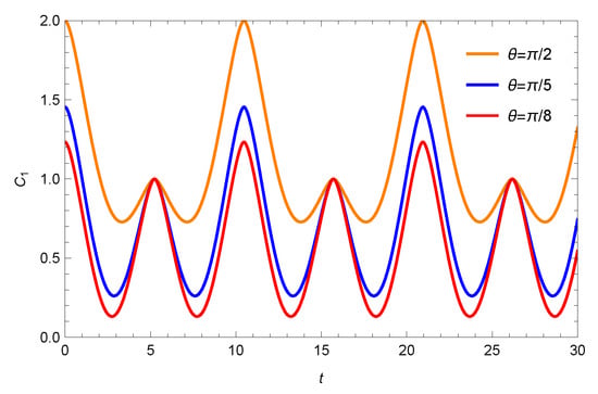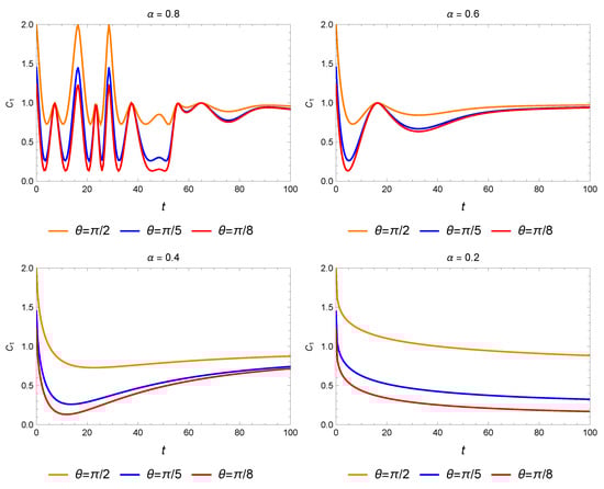 This section is based on the fractional model given by Equation (2), which is characterized by raising the imaginary unit i to the fractional power . The model used and the corresponding calculation process are not elaborated here, we directly present the results. Considering that the shared entangled state is expressed by Equation (12), the entangled state after fractional order evolution over time can be expressed as