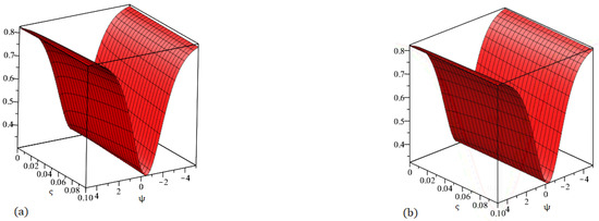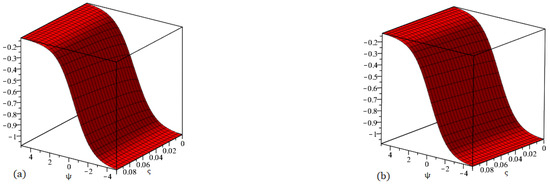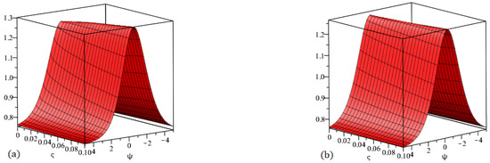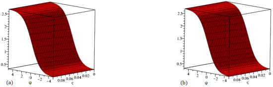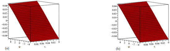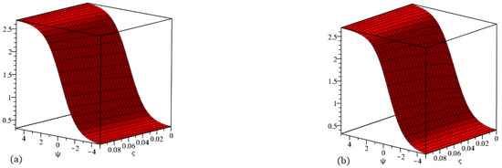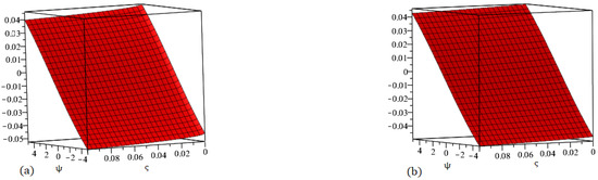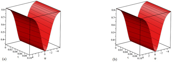 Here, we report the results of our numerical simulations of the nonlinear time-fractional Hirota–Satsuma coupled KdV and MKdV equations using the proposed technique. We used 2D and 3D graphs and tables to show the behaviour of the obtained solution. Figure 1, Figure 2 and Figure 3 represent the 3D comparison plots of the exact and YTIM solutions of Example 5.1 for ,, and , while Figure 4, Figure 5 and Figure 6 represent the 3D solution graph at of Example 5.1 for ,, and . Similarly, Figure 7, Figure 8 and Figure 9 represent the 3D as well as the 2D solution graph at different fractional orders of Example 5.1. Also, Table 1, Table 2 and Table 3 show a comparison of the exact solution with the proposed method solution at different fractional orders of for , , and . We compare the solution of the third-order approximation with FRDTM in Table 4, Table 5 and Table 6. The comparison shows a high degree of agreement between the analytical and exact results. This suggests that the solutions generated by YTIM are more suitable than those obtained FRDTM. Thus, compared to FRDTM, the suggested strategy is a dependable, innovative method that needs less calculation time and is simpler and more adaptable. In the same manner, Figure 10 and Figure 11 represent the 3D comparison plots of the exact and YTIM solutions of Example 5.2 for and , while Figure 12 and Figure 13 represent the 3D solution graph at of Example 5.2 for and . Similarly, Figure 14 and Figure 15 represent the 3D and 2D solution graph at different fractional orders of Example 5.2. Also, we compared the absolute error of the third-order approximation with q-HATM in Table 7 and Table 8 for and . These error tables were essential for evaluating both methods’ accuracy and convergence. A smaller absolute error suggests a more accurate approximation, suggesting that our approach is capable of accurately simulating the behaviour of the associated nonlinear partial differential equations. The tabular and graphical representations have verified that fractional-order solutions converge to integer-order solutions. Our solution series quickly converges to the precise solution when we simply compute the iteration up to three terms. A few more iterations could be investigated, in order to improve the accuracy of the estimated results. We can simulate and visualise the physical characteristics of a non-linear problem with FC, which allows us to examine and evaluate its physical behaviour. The method that has been proposed is more effective and appropriate for examining complicated coupled fractional-order problems. By Maple 2015, all of the numerical computations have been performed.