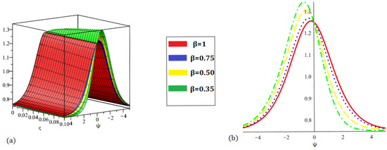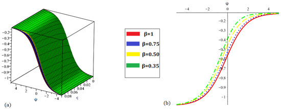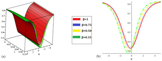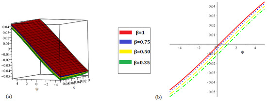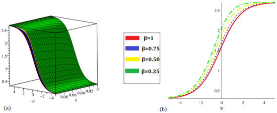 Graph (a) demonstrating three-dimensional and (b) demonstrating two-dimensional nature of the proposed method result for at various fractional orders of .