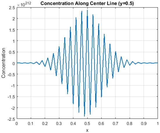 This numerical strategy balances computational efficiency and accuracy while faithfully preserving the intrinsic memory and boundary-driven dynamics of the fractional diffusion process. Validation through grid refinement and convergence analyses confirms the robustness of the proposed scheme. The next sections present simulation results supported by detailed visualizations and interpretations. To illustrate the capabilities of the proposed scheme, we begin by analyzing the concentration profiles along the domain’s centerline, as shown in Figure 1.