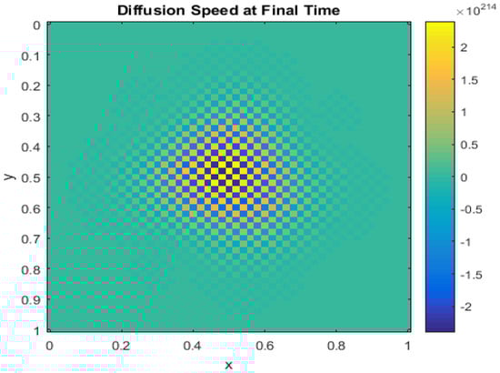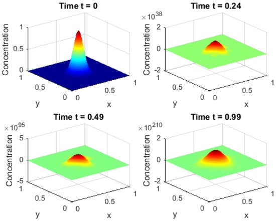 To complement the grid sensitivity analysis presented in Figure 4, we conducted a quantitative assessment of the numerical error by evaluating the difference between solutions obtained upon successive grid refinements. Specifically, the norm of the difference between solutions computed with and was compared against that between and . The observed reduction in the error norm with grid refinement confirms the expected convergence behavior of the finite difference scheme applied to the fractional diffusion model. The decreasing trend of the numerical discrepancy upon mesh refinement serves as a practical indicator of numerical consistency and stability. This comparative approach, widely adopted in numerical analysis, validates that the discretization captures the main diffusion dynamics without introducing significant numerical artifacts. Moreover, the convergence trend supports the reliability of the results presented, ensuring that the key phenomena illustrated in the simulation outputs are not artifacts of discretization but reflect the genuine behavior of the modeled system.