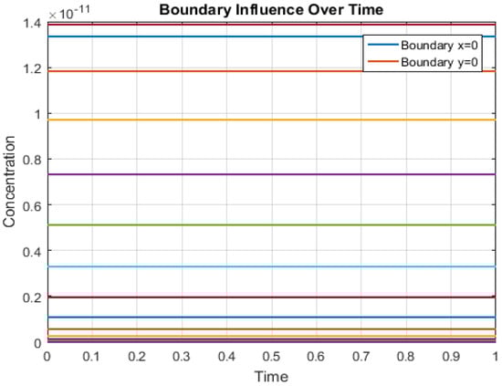 Figure 3 highlights the crucial influence of boundaries on drug concentration dynamics by plotting the concentration values at the boundaries ( and ) over time. This visualization reveals how non-local boundary conditions, often represented by integral terms, influence the diffusion process within a domain. The curves highlight the dynamic interaction between the internal points of the system and the boundaries, providing insight into the interrelationship between the internal and boundary-driven dynamics. The figure reflects how integral boundary conditions can lead to unconventional behavior, such as delayed or enhanced effects on the internal distribution of the drug concentration, depending on the degree of spatial interaction and temporal memory embedded in the system. Analyzing this effect is crucial to understanding how domain edges contribute to shaping the internal patterns of diffusion, especially in systems characterized by non-local interactions. Furthermore, the figure provides a link between local effects at the boundaries and the overall patterns governing the entire system, bridging the gap between internal and boundary dynamics. This analysis provides a useful tool for improving diffusion models across unconventional domains, and helps design more accurate strategies for controlling drug distribution in biological and engineering applications.