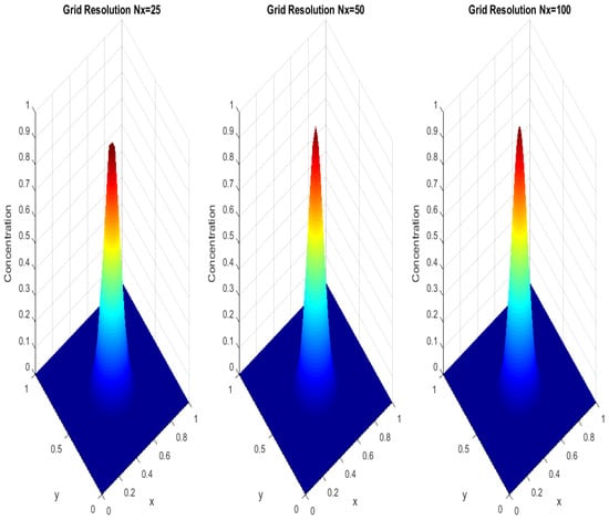 Figure 4 evaluates the impact of numerical grid resolution on the quality and accuracy of the simulation solutions. By comparing the results at different levels of partitioning (e.g., Nx = 25, 50, 100), the figure highlights the delicate balance between computational cost and solution accuracy. Higher-resolution grids show more accurate details of the diffusion process, with better representation of fine gradients and rapid changes in drug concentration, while lower-resolution grids may introduce significant errors, such as over-smoothing or the inability to capture complex system dynamics. The figure illustrates how insufficient numerical partitioning can lead to biases or oversimplifications of the dynamics, highlighting the importance of choosing an appropriate grid resolution that meets the model requirements. Furthermore, this evaluation helps ensure that the simulation results are robust and convergent, as they show low sensitivity to changes in grid resolution at a given level. This analysis contributes to increased confidence in the numerical outputs, making the simulation more reliable and applicable to a wide range of scenarios. It also provides valuable guidance for choosing the optimal mesh resolution, taking into account computational limitations, especially in biological and engineering applications that require accurate modeling of diffusion in complex tissues or materials.