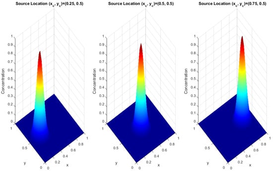 Figure 5 explores the effect of the initial drug source location on diffusion patterns within the domain. By varying the source location across the domain, the figure reveals the sensitivity of the system to initial conditions and how they affect the diffusion process. The distributions resulting from these changes show how the fractional dynamics respond to the source location, with a particular focus on gradient formation and the interaction of the diffusion process with boundaries. This study highlights the flexibility of the model in handling diverse initial configurations, adding depth to the analysis and highlighting the ability to simulate different scenarios involving multi-site drug sources. The results reveal how the source location affects the concentration distribution over time, as interactions with boundaries and internal gradients can significantly alter them. By understanding this relationship between the initial source location and diffusion patterns, this analysis provides a powerful tool in real-world applications, such as targeted drug delivery, where controlling the source location may be necessary to achieve optimal drug distribution in biological tissues. Additionally, this research helps improve targeted delivery strategies and enhance therapeutic efficacy by modeling diffusion behavior in complex environments.
