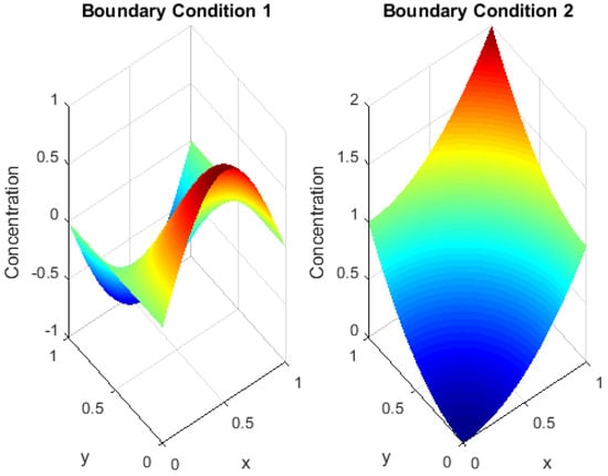 In the context of drug diffusion in biological tissues, boundary conditions model crucial physiological interactions at tissue interfaces. For example, Dirichlet conditions may represent fixed drug concentrations at vascularized boundaries, reflecting controlled drug delivery from blood vessels. Neumann conditions can simulate passive diffusion barriers or controlled release at semi-permeable membranes, while more complex non-local or integral conditions model heterogeneous tissue interactions and active transport mechanisms. By varying these conditions in our simulations, we captured different physiological scenarios such as targeted delivery near vascular structures, diffusion in bounded tissue compartments, and dynamic exchange at tissue interfaces. This exploration supports the biological plausibility of the model and underscores the impact of boundary phenomena on drug distribution within living tissues. Additionally, the simulation results presented in Figure 6 clearly illustrate how varying boundary conditions significantly alters the diffusion patterns within the domain. This numerical evidence supports the biological insight that tissue boundaries, such as membranes, vascular interfaces, or compartment walls, actively influence drug spread by acting as either barriers, reservoirs, or exchange sites. Therefore, our computational exploration of boundary conditions provides both theoretical and practical understanding of their crucial role in predicting drug dynamics in heterogeneous biological environments.