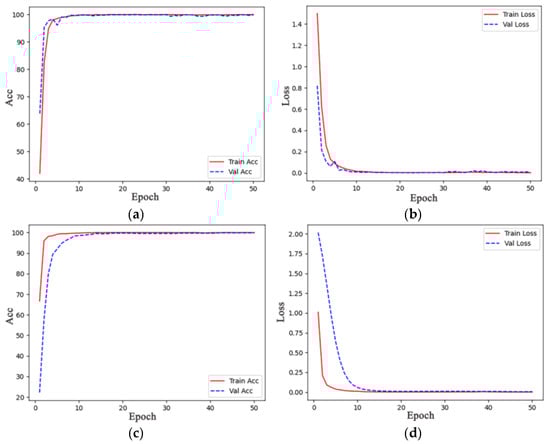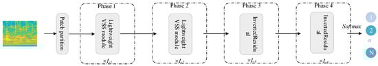 - The VMamba-Conv model is constructed, and the training parameters of the model are initialized. The time–frequency graph is input into VMamba-Conv for feature extraction and fault identification. Based on EMA, the training set is input into the VMamba-Conv model for training. The validation set is used to continuously optimize the model parameters until the iteration is complete and the trained model is obtained.