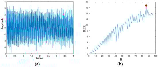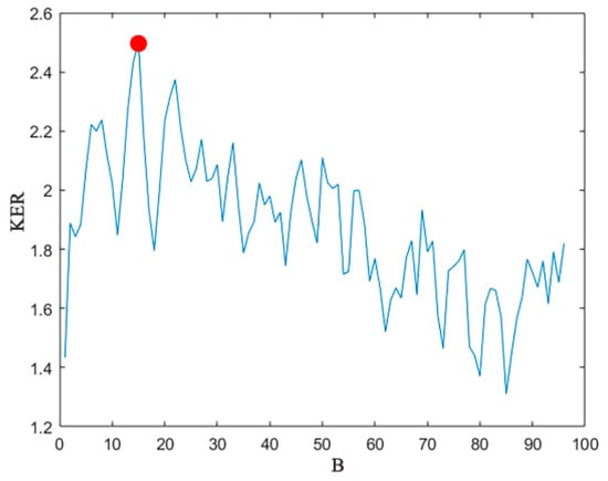 - Parameter selection is performed, guided by KER. Since the number of frequency boxes B per octave has the greatest influence on the calculation results of CQ-NSGT, this study only considers the optimal selection of this parameter. Other parameters of CO-NSGT are set as default parameters. Specifically, the default window function is “hann”, the minimum frequency ξmin is greater than or equal to the ratio of the sampling frequency ξs to the signal length N, and the maximum frequency ξmax is strictly lower than the Nyquist frequency ξs/2. Additionally, considering that kurtosis and Rényi entropy can, respectively, describe the impact characteristics and energy concentration related to rolling bearing faults [24], the higher the kurtosis, the more concentrated the time–frequency energy, the stronger the signal impact characteristics; the lower the entropy, the more concentrated the energy distribution, the greater the concentration represented by the time–frequency, the better the aggregation. Compared with the classical Shannon entropy, Rényi entropy can flexibly adjust its sensitivity to the signal energy distribution through the parameter α, making it more suitable for characterizing transient features and energy fluctuations in nonlinear and nonstationary vibration signals. A kurtosis entropy ratio method is proposed. The larger the KER value, the better the comprehensive performance of the impulse characteristics and time–frequency aggregation of the signal. Therefore, the larger its value, the more in line it is with the goals of fault signal analysis and parameter optimization, and it is used to find the optimal parameter B of the original CQ-NSGT. This method is capable of simultaneously measuring the time–frequency resolution and impact fault information of TFR. The KER principle is as follows: