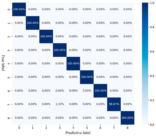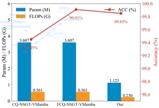 - The results show that the method proposed in this paper improves the indicators of ARI, NMI, F1, and ACC by 0.94–3.81%, 1.05–3.51%, 0.40–1.72%, and 0.40–1.72%, respectively, compared with the control methods. Moreover, the computational complexity and the number of parameters are reduced by approximately 59% and 69%, respectively, compared with CQ-NSGT-VMamba and FCQ-NSGT-VMamba. Its average classification accuracy rate reaches 99.85%, which is close to the 99.91% seen for FCQ-NSGT-VMAMBA and is superior to the 99.45% seen for CQ-NSGT-VMAMBA. Moreover, FCQ-NSGT shows an improvement of 0.46% compared with CQ-NSGT. This method not only improves the computational efficiency of the model and makes it more lightweight, but also shows high diagnostic performance and noise resistance, opening up new possibilities for the application of lightweight state space vision models in fault diagnosis in rolling bearings.