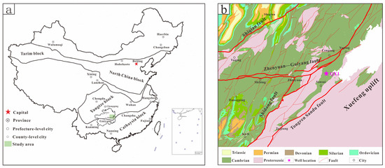Geological background of the study area [29]. (a) Location and regional geological map of the study area. (b) Location of the QX1 well.