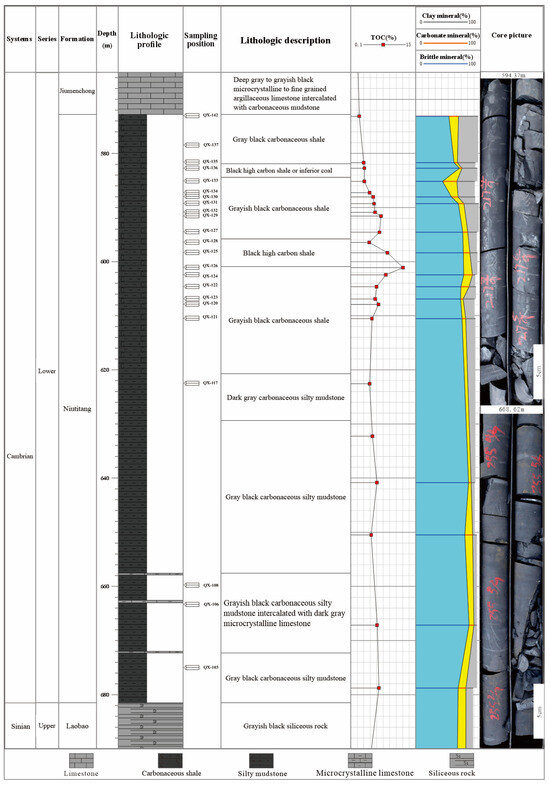 The QX1 well is situated within the Sansui syncline, located between the Tongren-Sandu Fault zone and the Guiyang-Zhenyuan fault zone, west of the Xuefeng Mountains (Figure 1b). This area represents a tectonic transition between the Xuefeng Uplift’s western margin and the Upper Yangtze Massif’s southeastern edge, characterized by intense NE- to NNE-trending fold-thrust systems with complex intersecting fault networks. Stratigraphy encountered in the QX1 well is, from top to bottom, Quaternary; Cambrian Palang Formation, Bianmachong Formation, Jiumenchong Formation, Niutitang Formation; Aurignacian Laobao Formation, Doushantuo Formation, and Nanhuasi Nantuo Formation (Figure 2) [29]. Among them, the Niutitang Formation in this well spans 572.81–681.48 m (108.67 m thick), predominantly comprising grayish-black, black carbonaceous shale and silty shale, interbedded with thin layers of dark gray argillaceous limestone. These strata exhibit elevated total organic carbon content (TOC), indicating favorable hydrocarbon source rock characteristics.
