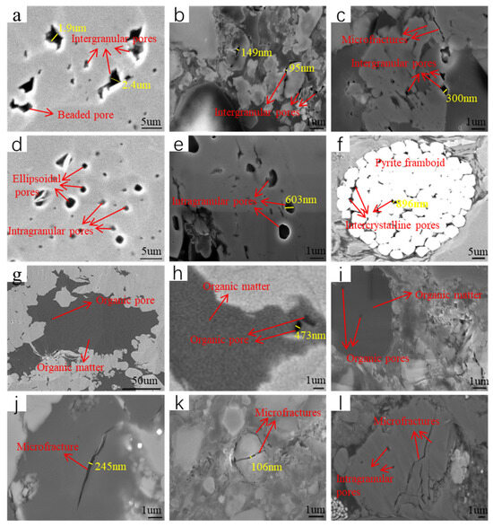 Microfracture formation predominantly originates from clay mineral desiccation shrinkage, dehydration reactions, mineral phase transformations, and thermal contraction. In Niutitang Formation shale samples, these fractures were relatively developed, primarily exhibiting irregular linear and striated morphologies (Figure 3j–l). Some microfractures even cut across several mineral grains (Figure 3k), establishing interconnectivity with adjacent pore systems. The fracture width is typically within hundreds of nanometers, while the fracture length can reach tens of micrometers. It shows good connectivity, which effectively improves the physical properties of the shale reservoir and establishes efficient migration pathways for shale gas.