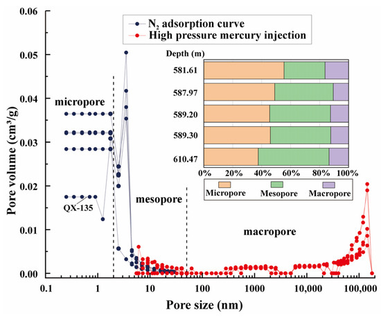 The joint characterization of the pore structure of shale samples from the Niutitang Formation in Well QX1. Notes: The inset shows the percentage of pore content for samples of corresponding depths.