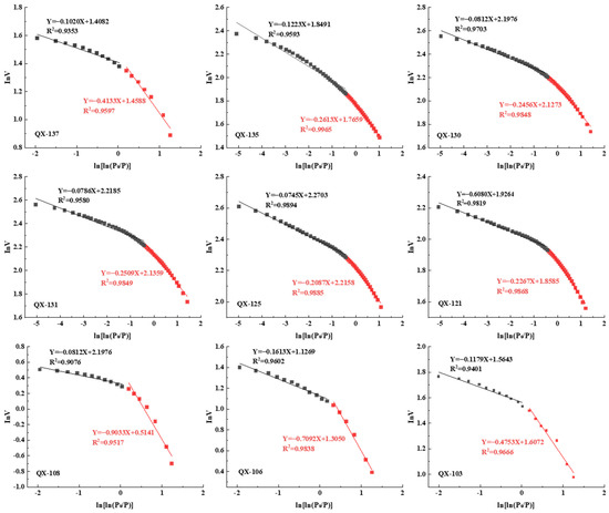 The analytical protocol involved constructing logarithmic plots of lnV versus ln[ln(P0/P)] from LTNA data following Equation (2), which were subsequently subjected to linear regression analysis. The fractal dimension value is calculated as K + 3, where K is the slope of the fitted curve. Previous studies have shown that nitrogen molecules exhibit different adsorption mechanisms at different pressure ranges. In the low-pressure region (0 < P/P0 < 0.5), nitrogen molecules primarily undergo monolayer adsorption, governed by van der Waals interactions [38], and the fractal dimension D1 reflects the irregularity of the pore surface. In the high-pressure region (0.5 < P/P0 < 1), nitrogen molecules undergo multilayer adsorption or capillary condensation phenomena, and the fractal dimension D2 reflects the pore distribution and connectivity. This mechanistic differentiation necessitated segmented curve fitting (Figure 9). As tabulated in Table 5, D1 values range from 2.8777 to 2.9392, with a mean value of 2.8991, approaching the theoretical maximum of 3, indicating that the shale pore surface is relatively rough and highly irregular, providing a larger specific surface area, which is beneficial for shale gas adsorption. The fractal dimension D2 has a wider range, varying from 2.0967 to 2.7913, with a mean value of 2.5945. Overall, the fractal dimensions of the shales in the study area are relatively high, and the fractal dimensions are D1 > D2, indicating that the shale pore system is characterized by a rough surface and the pore network has a certain degree of connectivity.