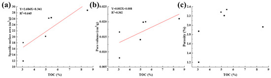 Relationship between pore structure parameters and TOC content. (a) The relationship between specific surface area and TOC content. (b) The relationship between pore volume and TOC content. (c) The relationship between porosity and TOC content.