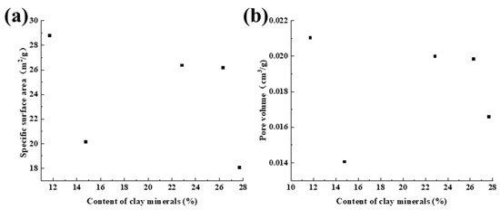 Relationship between pore structure parameters and content of clay minerals. (a) The relationship between specific surface area and content of clay minerals. (b) The relationship between pore volume and content of clay minerals.