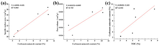 Relationship between pore structure parameters and carbonate minerals content. (a) The relationship between specific surface area and carbonate minerals content. (b) The relationship between pore volume and carbonate minerals content. (c) The relationship between TOC and carbonate minerals content.