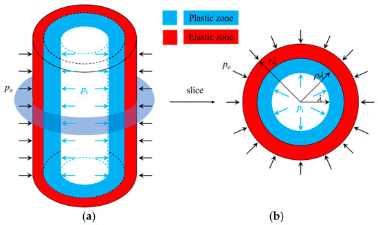The theoretical diagram of the thick-walled cylinder is shown in Figure 1. The red region indicates the elastic zone, while the blue region represents the plastic zone. With the increase in effective stress, the inner radius of the capillary decreases, leading to plastic deformation within the capillary. Due to stress concentration, the stress plastic rings first form in the inner wall of the capillary and gradually expand outward. Figure 1a,b depict the pressure on a three-dimensional single capillary and its cross-sectional slice under elastic-plastic deformation conditions.