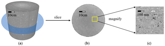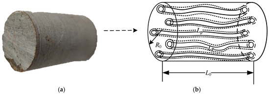 For actual shale core samples, the number of capillaries inside the shale core is quite large, and the degree of curvature between each capillary varies. Establishing the relationship between the variation in radius and the length change of each capillary from a single capillary is challenging. This paper addresses this challenge by assuming uniform variation in the length and radius of different capillaries with stress across the entire shale core sample. As shown in Equations (3) and (7). Figure 2 represents conversion of real rock sample of deep shale to capillary model.