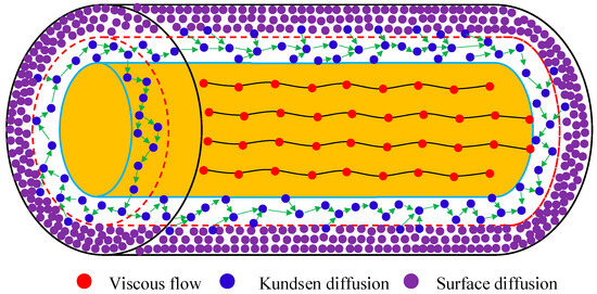 Under isothermal conditions, the mass transfer of shale gas in nanoporous media is governed by multiple transport mechanisms: viscous flow, Knudsen diffusion, molecular diffusion, and surface diffusion. Molecular diffusion refers to the phenomenon where molecules of a substance (such as gases, liquids, or solids) spontaneously migrate from regions of high concentration to regions of low concentration, driven by random thermal motion under a concentration gradient. In contrast, viscous flow refers to the directed macroscopic flow of gases driven by a pressure gradient through pores or fractures, which essentially represents the macroscopic manifestation of internal friction between fluid molecules (viscous forces). At the same time, surface diffusion involves gas molecules migrating along adsorbed layers on pore surfaces (refer to Figure 3). Typically, the Knudsen number Kn = lg/λ, which is the ratio of the free path length of gas molecules lg to the characteristic length L of the porous medium, is used to determine the gas transport mode in porous media [29]. The free path length of gas molecules lg can be mathematically expressed as:
