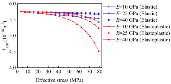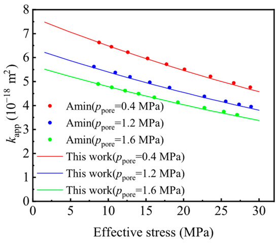 Under varying effective stresses, the three-color curves represent the predicted values of the apparent gas permeability at different pore pressures in Figure 4. The three-color scatter displays Amin’s experimental data [10], with each color representing the values measured at different pore pressures. The close agreement between the model predictions and experimental data confirms the reliability of the proposed approach. Young’s modulus and Poisson’s ratio are smaller in our work than in the work of predecessors. The reason is that the deformation of the entire shale rock sample is the sum of the deformation of each individual capillary. From a scientific perspective, Young’s modulus and Poisson’s ratio represent the constitutive properties of the capillaries.